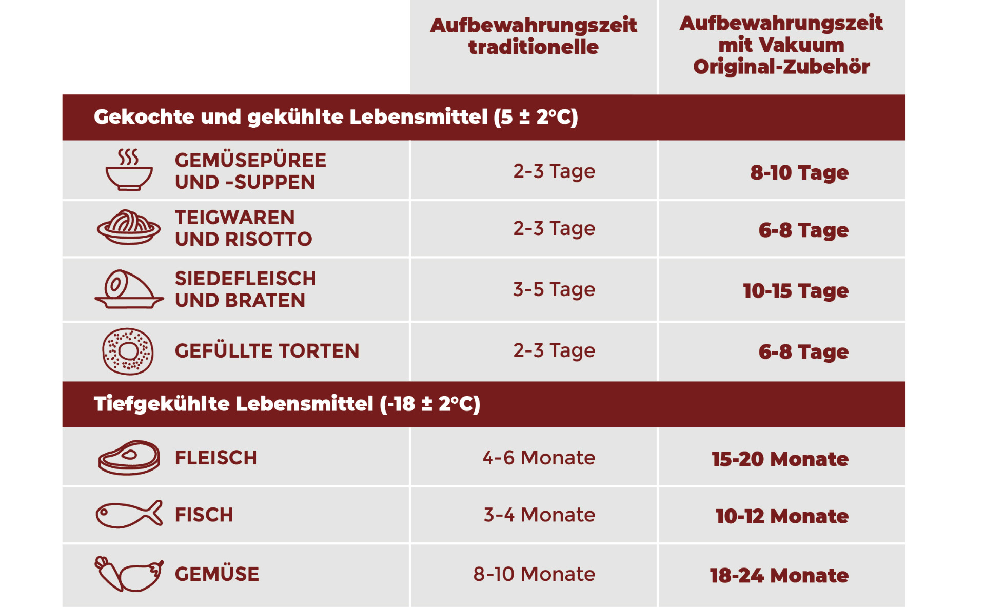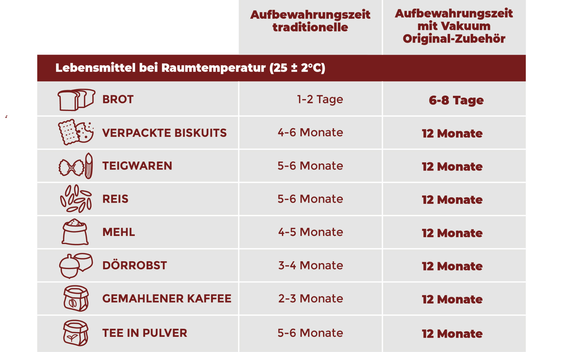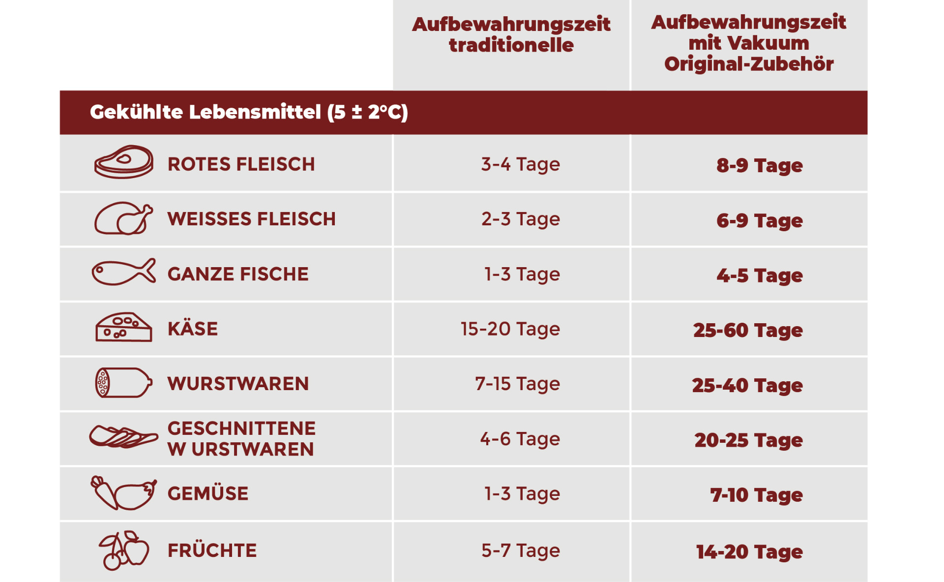 Schauen Sie die Vergleichstabelle und finden Sie heraus, wie sich die Konservierung der gängigsten Lebensmittel verändert.