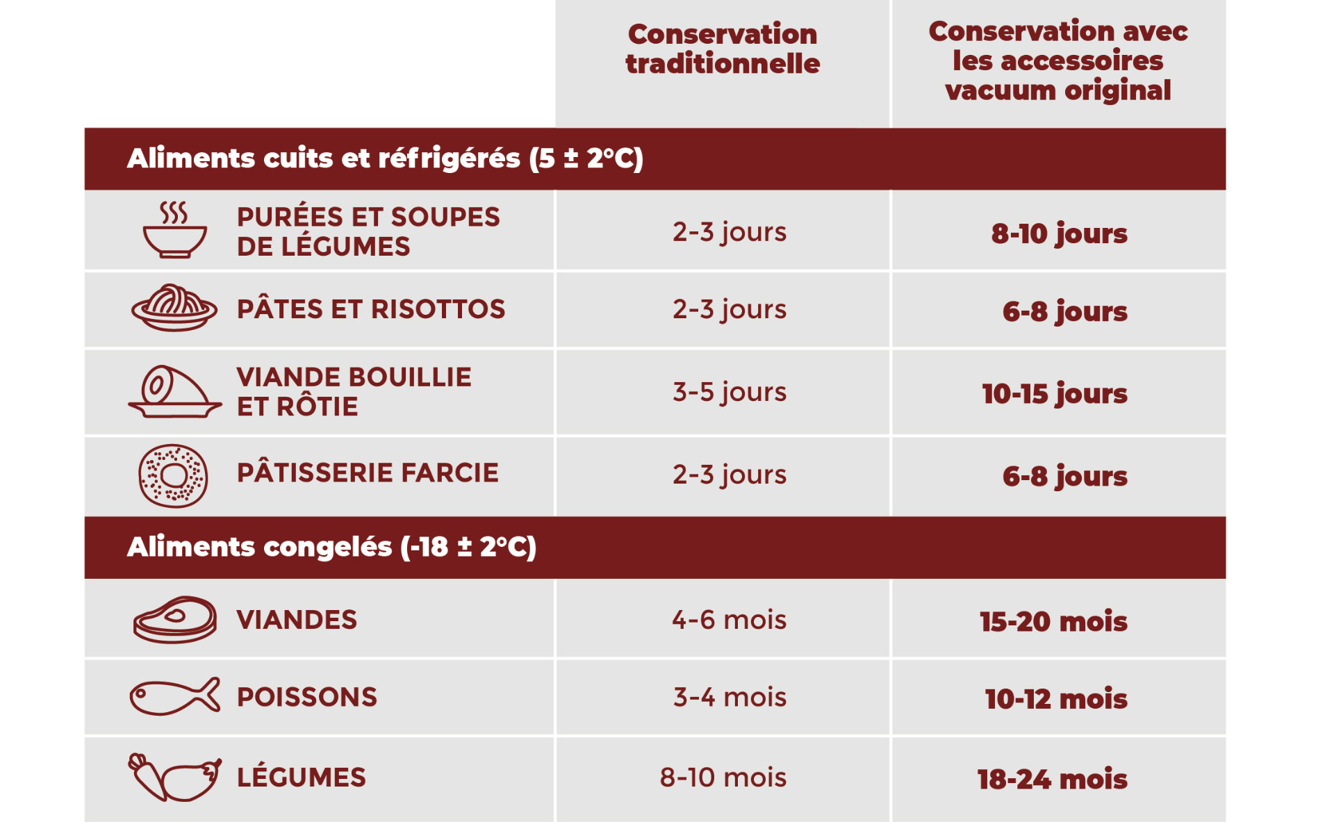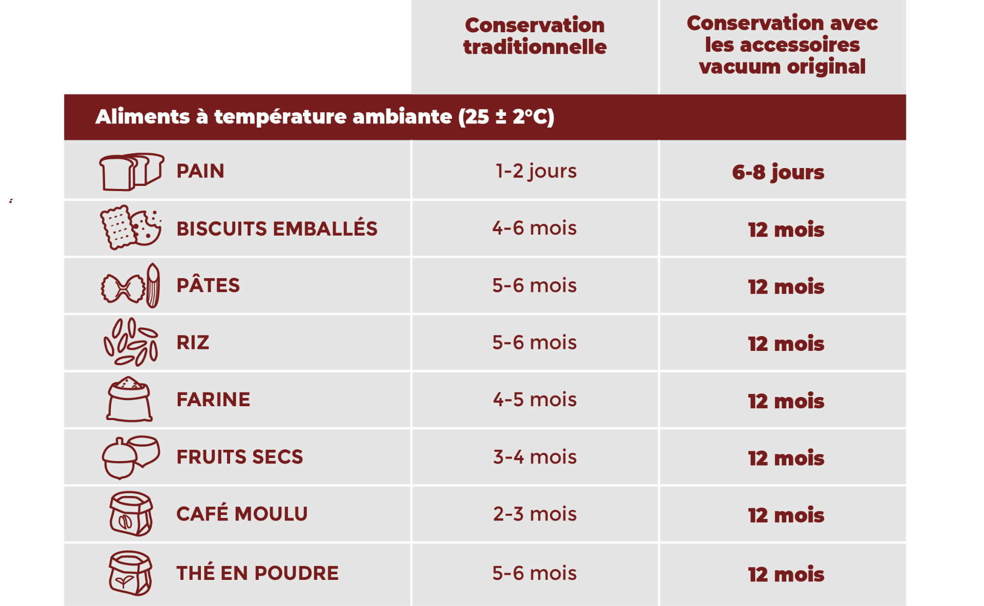 Regardez le tableau de comparaison et découvrez comment change la conservation des aliments plus communs.