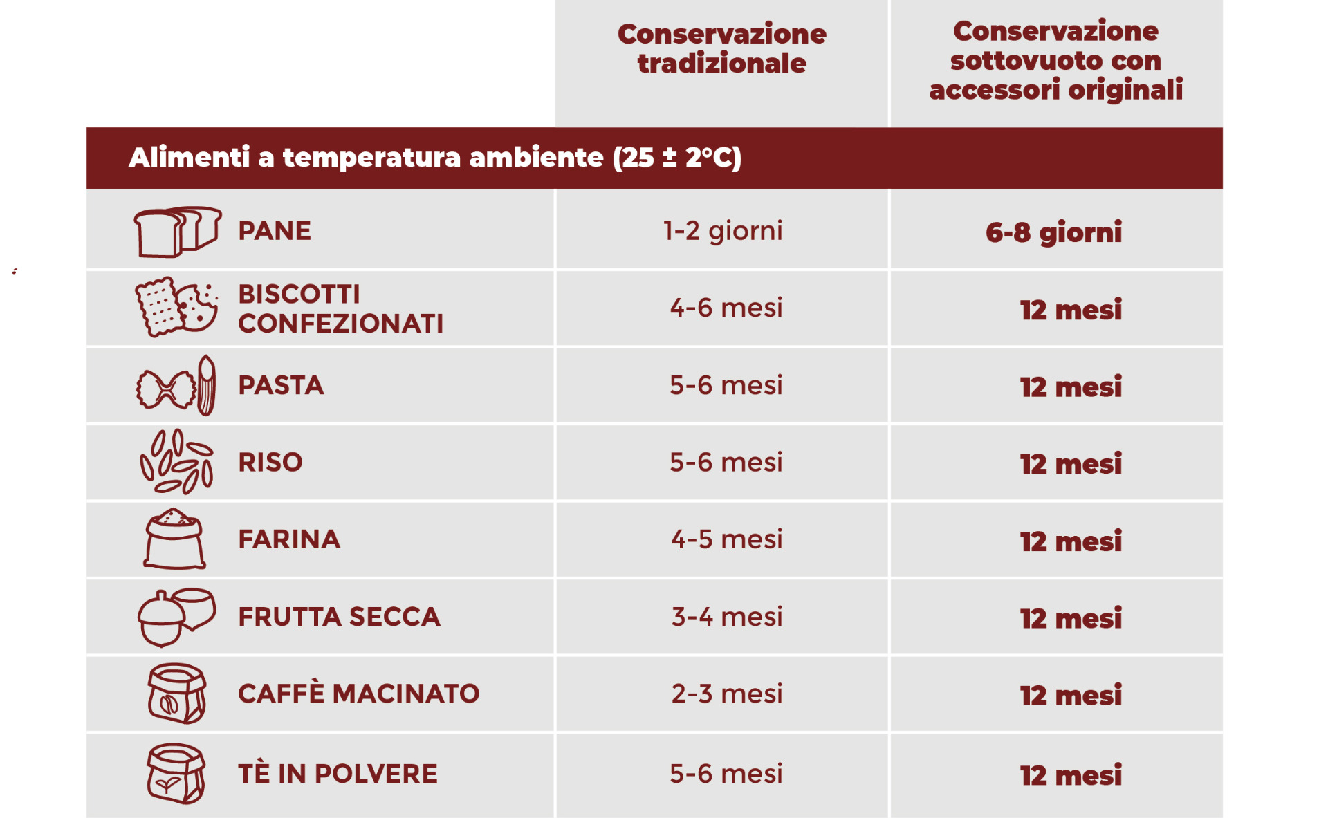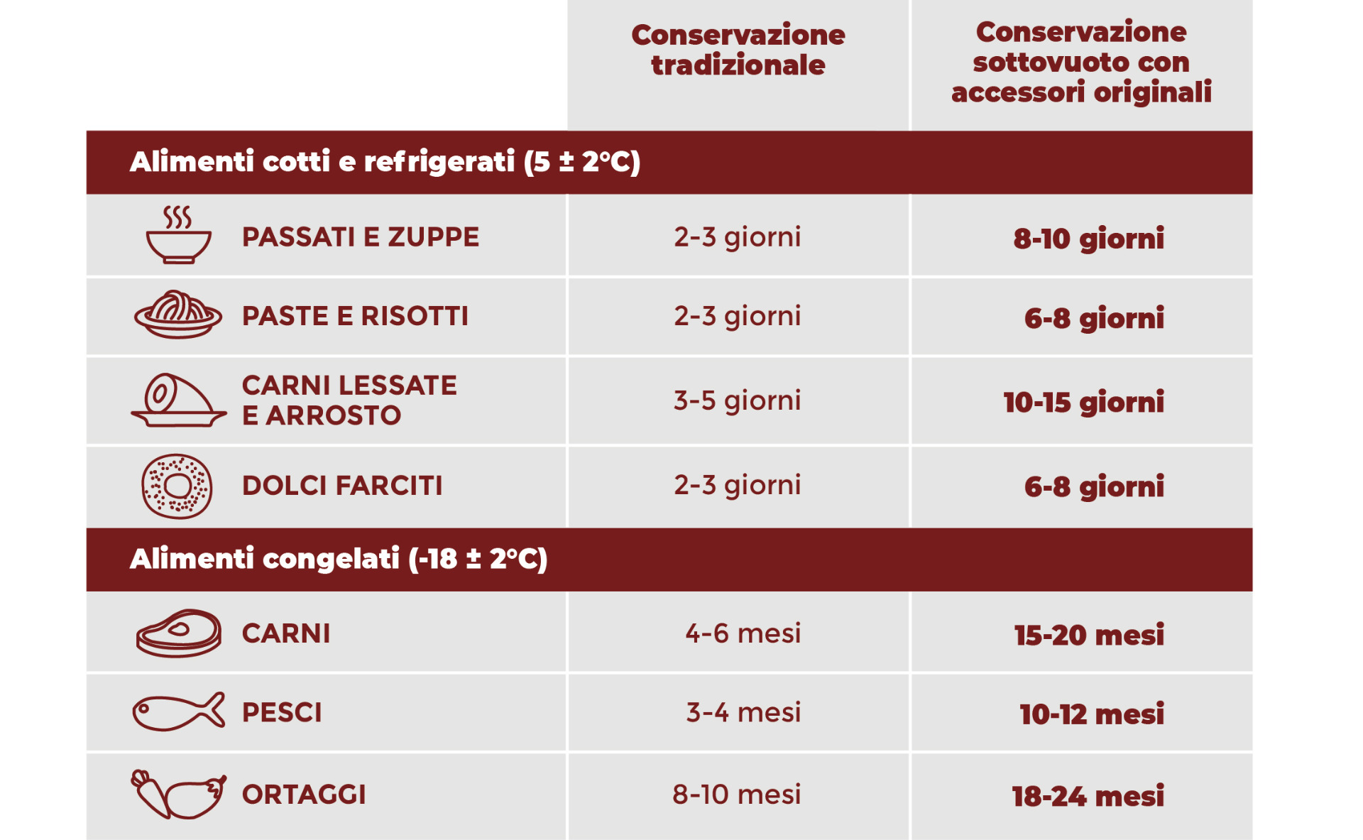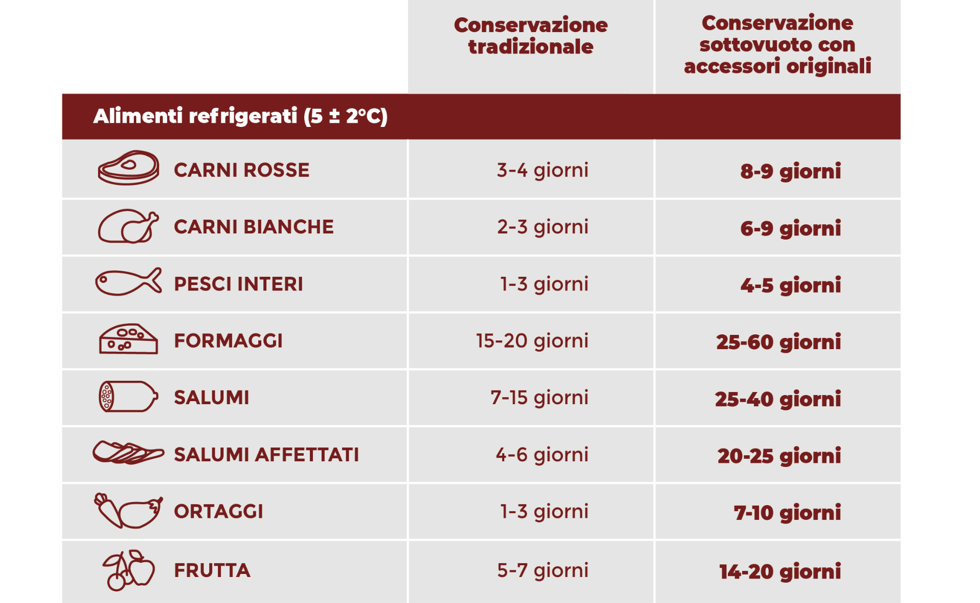 *Valori indicativi che dipendono comunque dall’integrità della confezione e dalle caratteristiche qualitative dell’alimento in origine, inoltre sono riferiti al confezionamento ottenuto con l’abbinamento macchina – sacchetti/rotoli, contenitori ed accessori “originali”.
